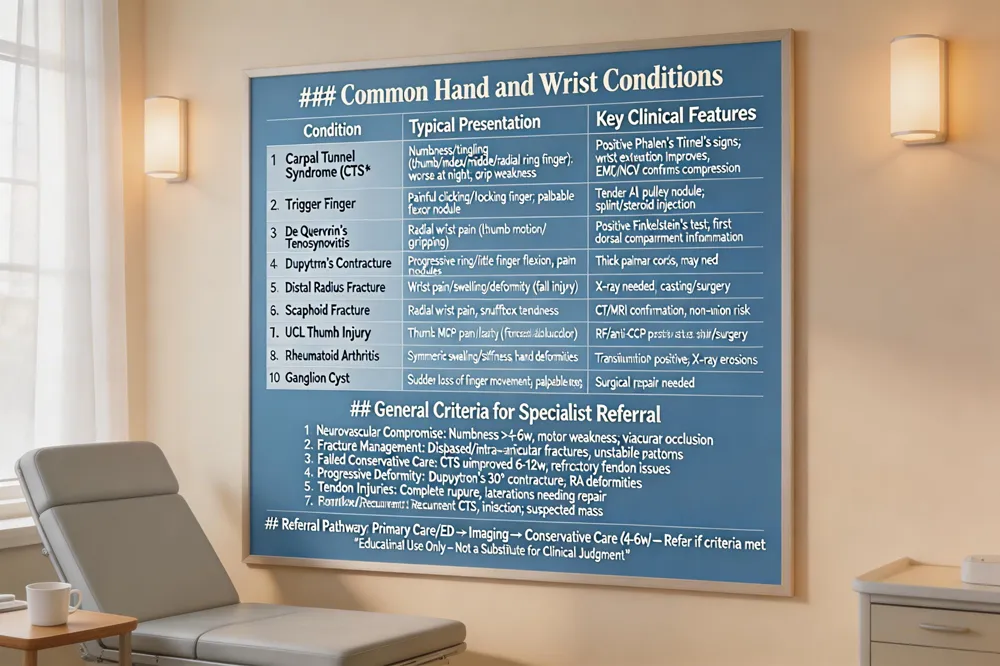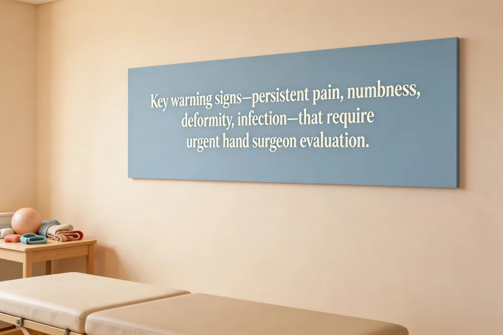 Persistent hand pain lasting more than 7-10 days often indicates underlying conditions requiring orthopedic evaluation is a classic red‑flag sign that an underlying orthopedic condition may be present. Equally concerning are Numbness or tingling in fingers can be a sign of nerve compression such as carpal tunnel syndrome —especially in the thumb, index, and middle fingers—that suggest nerve compression such as carpal tunnel syndrome; when these sensory changes are accompanied by weakness in grip strength, early orthopedic evaluation is essential. Visible swelling, bruising, or deformity of the hand after trauma points to possible fractures, ligament tears, or tendon ruptures, all of which require prompt imaging and specialist care. Loss of motion or grip strength, difficulty performing fine‑motor tasks, and a sudden inability to straighten a finger or wrist also flag joint, tendon, or nerve pathology that should be assessed by a hand surgeon. Signs of infection—redness, warmth, fever, or a painful lump indicate a deeper systemic issue and demand urgent medical attention. First‑sign nerve‑damage indicators include intermittent “pins‑and‑needles,” reduced sensation, and early weakness, which may progress if left untreated. If any of these red‑flag symptoms appear, schedule an appointment with an orthopedic hand specialist without delay.