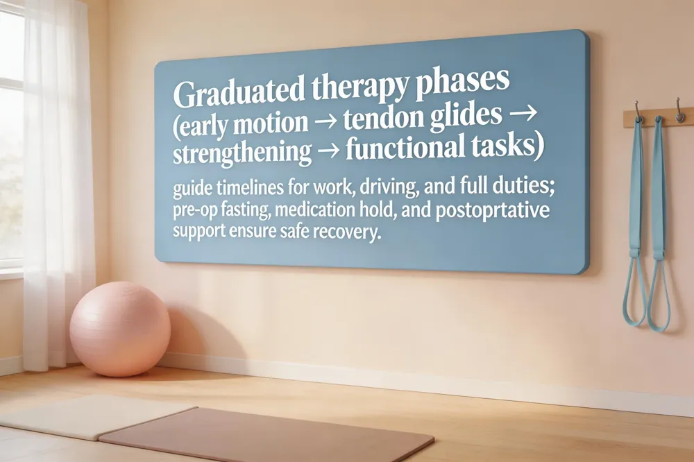 Early postoperative protocols begin with gentle active motion of non‑splinted joints within 24‑48 hours, progressing to protected range‑of‑motion exercises (EAM) during the inflammatory phase (0‑10 days). By days 10‑28, reparative therapy adds tendon glides, joint mobilizations, and gentle strengthening; remodeling (28 days‑12 months) introduces functional tasks and graded resistance. Hand therapists educate patients on elevation, ice (20 min q 2‑3 hrs), splint care, and signs of infection to promote optimal healing.