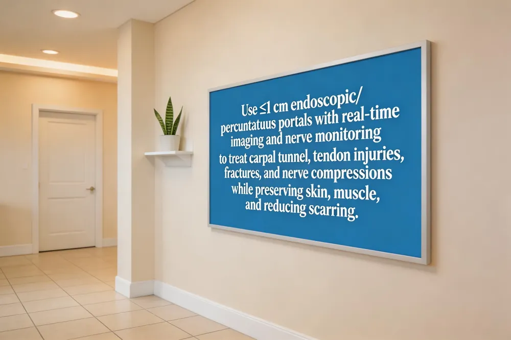 Endoscopic, arthroscopic, and percutaneous tools are the cornerstones of this approach. An endoscope or arthroscope provides a high‑resolution video view through a 1‑cm or smaller portal, allowing precise cutting, debridement, or hardware placement. Percutaneous devices, such as fine needles or intramedullary nails, enable fracture fixation or tendon release through millimeter‑sized entry points. Intra‑operative imaging—fluoroscopy, ultrasound, or real‑time MRI—guides instrument navigation and confirms hardware positioning, while nerve monitoring protects the median, ulnar, and radial nerves during delicate decompressions.