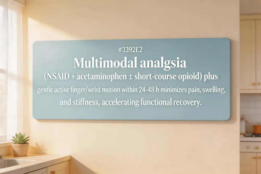 Guided early motion to prevent stiffness – Begin gentle active finger and wrist motions within 24‑48 h (as instructed by the hand therapist). Early protected range‑of‑motion promotes tendon gliding, reduces adhesions, and accelerates functional recovery.