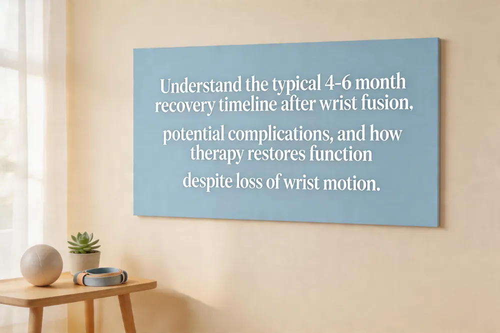 Most patients wear a splint or cast for about 6–8 weeks while the wrist bones fuse. Light daily activities can usually resume after this period, but heavy lifting is avoided until the first post‑operative visit (often ~2 weeks) and the bones are confirmed to be healing. Physical or occupational therapy typically begins 2–3 weeks after surgery to restore finger motion and begin gentle strengthening. Full grip strength, functional hand use, and final bone consolidation generally take 3–6 months of gradual rehabilitation, with a total recovery timeline of roughly 4–6 months before unrestricted activities.