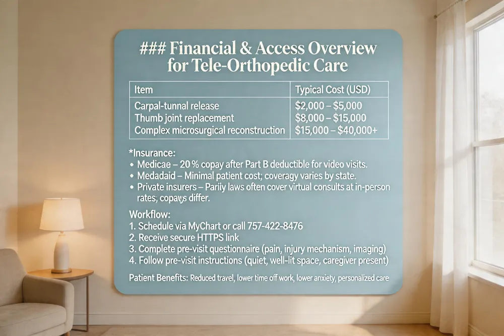 At OrthoVirginia, the appointment‑booking workflow is streamlined: patients use MyChart or call 757‑422‑8476 to request a telehealth slot, receive a secure HTTPS link, and complete a pre‑visit questionnaire that captures pain level, mechanism of injury, and imaging. The platform’s ‑‑visit instructions (quiet, well‑lit space, caregiver present) reduce technical glitches and enhance compassionate communication.