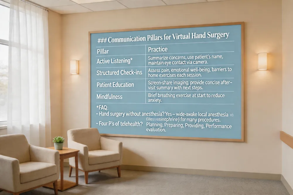 Effective virtual hand surgery visits rely on three core communication pillars. First, clinicians practice active listening, maintain eye‑contact by looking directly at the camera, and use a calm, reassuring tone; these behaviors, shown to raise patient satisfaction and adherence (Johnson et al., 2025; Patient and Provider Experiences 2024). Second, structured check‑ins are built into each session: the surgeon asks about pain levels, emotional well‑being, and any barriers to home‑based exercises, mirroring Dr. Rebecca S. Yu's patient‑centered protocol. Third, patient education is enhanced by screen‑sharing imaging studies in real time, followed by a concise after‑visit summary that outlines next steps, medication instructions, and contact information for urgent concerns. To further reduce anxiety, clinicians can lead a brief mindfulness or breathing exercise at the start of the visit, a practice that has been linked to lower stress and stronger therapeutic rapport (Telemedicine: Is It a Tool for Orthopaedics? 2025).