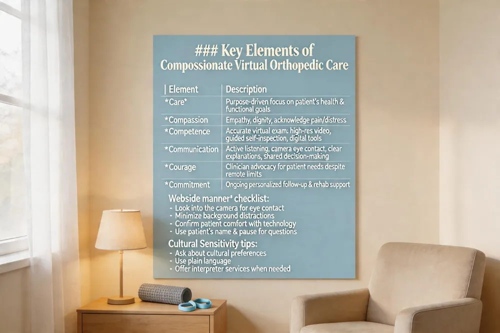 Compassionate care in tele‑orthopedics means recognizing a patient’s pain or distress and taking purposeful actions to relieve it—blending empathy, respect for autonomy, cultural competence, and technical skill. Core elements include active listening, clear explanations, shared‑decision making, and timely, personalized follow‑up. The widely cited 6 C’s framework (Care, Compassion, Competence, Communication, Courage, Commitment) guides clinicians: Care drives the purpose of every encounter; Compassion adds empathy and dignity; Competence ensures accurate virtual examination (high‑resolution video, guided self‑inspection); Communication fuels shared decision‑making; Courage empowers surgeons to advocate for patients even when remote assessment is limited; Commitment reflects ongoing dedication to recovery.