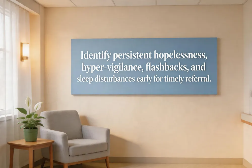 Patients who have experienced hand or upper‑extremity trauma often display a mixture of behavioral and emotional signals that signal an ongoing trauma response. Common signs include persistent feelings of hopelessness or a bleak outlook for the future, emotional numbness or detachment from self and others, difficulty concentrating, making decisions, or remembering details, an exaggerated startle response with constant hyper‑vigilance to potential threats, and intrusive recollections or flashbacks that replay the traumatic event. These reactions can be amplified by the stress of surgery, pain, or the uncertainty of functional recovery. When such symptoms linger beyond a few weeks, interfere with daily activities, or are accompanied by sleep disturbances, nightmares, or avoidance of rehabilitation exercises, a professional evaluation is warranted. Early screening using tools like the PHQ‑9 or GAD‑7, followed by referral to a psychologist or rehabilitation therapist, can prevent chronic PTSD, depression, or anxiety and improve adherence to postoperative protocols, ultimately supporting faster functional recovery.