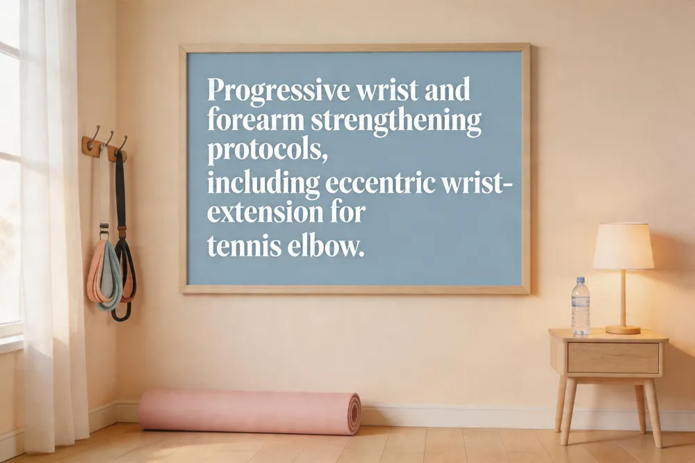 Begin with wrist‑flexor and extensor stretches : hold 15‑30 s, repeat 2‑4 times per side. Follow with a tennis‑ball roll (10‑15 rolls a few times daily). Strengthen wrist flexors with 0.5‑1 kg resistance, 8‑12 slow reps, 2‑3 sets, and add an isometric flexion hold (5‑10 s, 5‑8 reps). Perform daily, advancing only when pain‑free; stop any sharp pain.