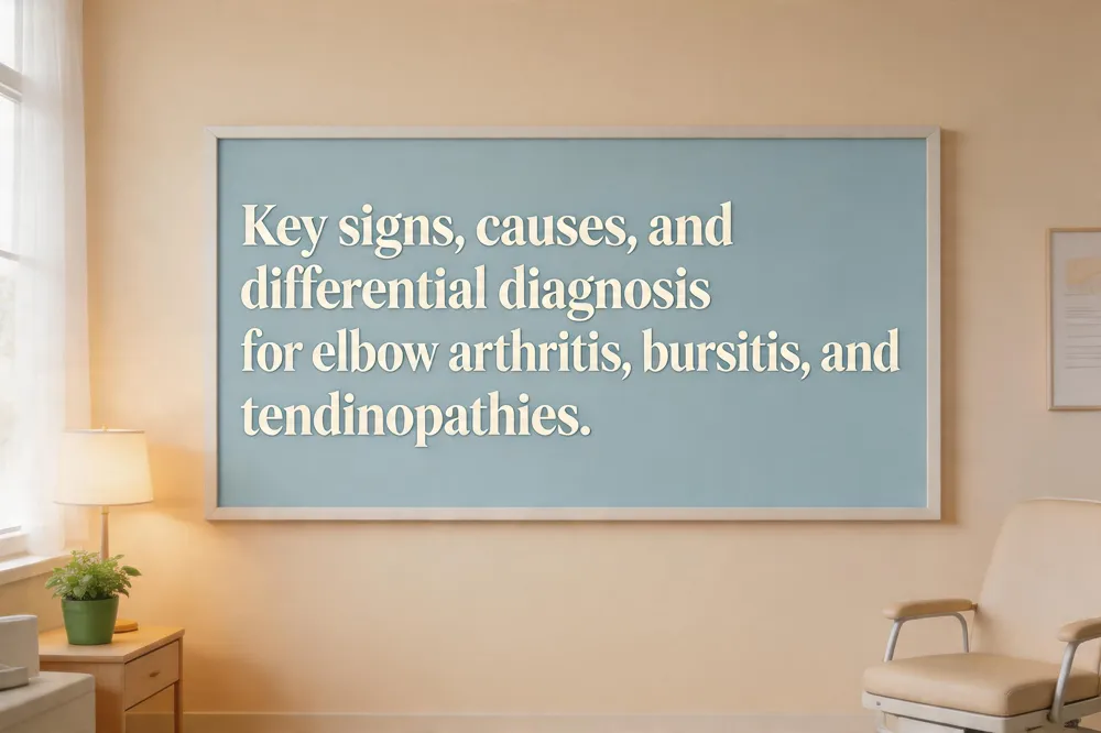 Elbow arthritis, bursitis, and tendinopathies such as tennis (lateral epicondylitis) and golfer’s (medial epicondylitis) elbow are the most frequent sources of elbow discomfort. Arthritis limits joint motion and causes deep ache; bursitis produces a fluid‑filled swelling over the olecranon; tendonitis creates localized pain at the epicondyle. Differential diagnosis includes nerve entrapment (cubital tunnel), ligament sprains, fractures, and infection, each with distinct patterns of pain, swelling, and sensory change.