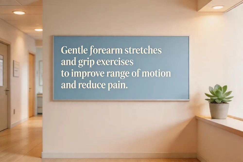 Gentle forearm stretches: wrist‑extension stretch (15 s, 5 × day) and wrist‑flexion stretch (same). Follow with wrist turn (palm‑up to palm‑down, 5‑10 slow reps twice daily). Light resistance (canned good or light dumbbell) for wrist lifts (10‑15 reps) once pain subsides. Finish with a 5‑second sock squeeze , 10 reps.