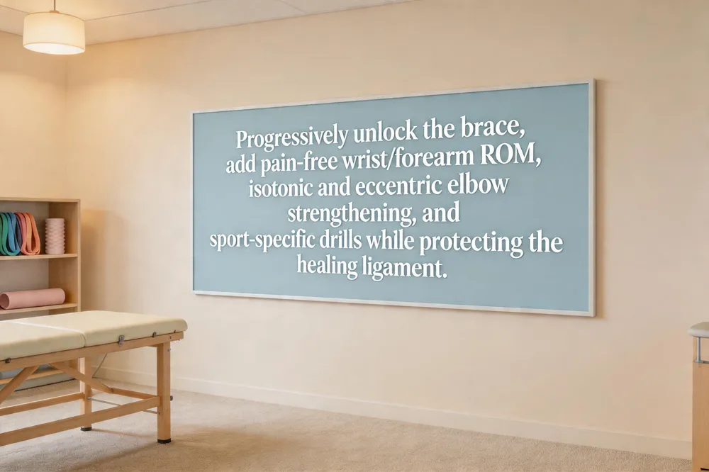 LCL and radial ligament repairs follow a similar phased approach. Immobilization in a posterior splint or brace (fully pronated) for 0‑2 weeks is followed by passive/active‑assisted ROM, progressing to active motion by week 4 while avoiding varus stress. Light wrist, forearm, and elbow resistance starts weeks 4‑8; eccentric strengthening and functional kinetic‑chain drills continue weeks 9‑13, with unrestricted activities expected by 14 weeks and full return to sport by 9 months.