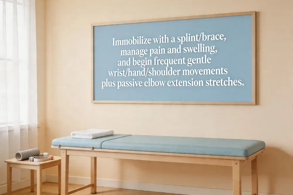 - Post‑fracture elbow physiotherapy: Early gentle active‑ and passive‑motion, dynamic splints, scar massage, and low‑load resistance prevent stiffness and restore ROM.