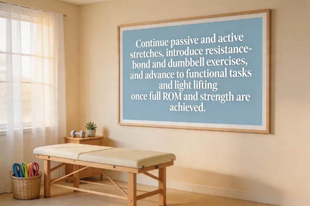 - Duration of physical therapy: Initial ROM work for 2‑6 weeks, then strengthening for 8‑12 weeks, with maintenance up to 6 months; full return to heavy activities may take 9‑12 months.