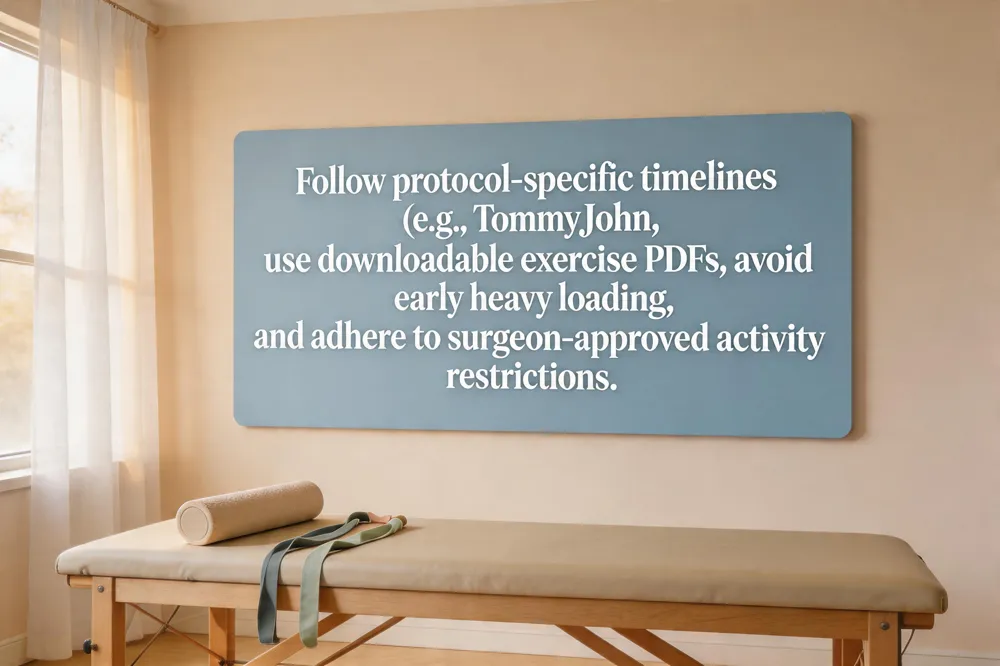 Early postoperative care for elbow ligament surgery focuses on protection, pain control, and gentle mobility. For UCL reconstruction, the first 21 days use a posterior splint or hinged brace locked at 90°; weeks 2‑4 gradually unlock the brace (30‑100° then 15‑110°) while adding painless wrist ROM, sub‑maximal shoulder and biceps/isometrics, scar massage, and edema compression. By weeks 4‑8 the brace is set to 10‑120° (later 0‑130°), allowing full elbow motion and light resistance wrist curls, forearm pronation‑supination, and rotator‑cuff work, with resisted external rotation delayed until week 6. Weeks 9‑13 introduce eccentric elbow flexion/extension, plyometrics, and sport‑specific drills such as the Thrower’s Ten; full throwing program begins after week 13 and most athletes return to sport between 5‑8 months, contingent on strength and functional criteria.