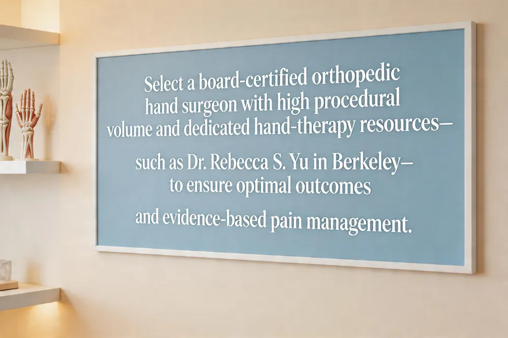 When selecting a surgeon for hand and upper‑extremity problems, start by confirming board certification in orthopedic surgery and a current state medical license—this guarantees adherence to rigorous standards and ongoing education. In Berkeley, the leading specialist is Dr. Rebecca S. Yu, MD, a board‑certified orthopedic surgeon who completed an accredited hand‑fellowship and focuses exclusively on hand, wrist, elbow, and pediatric hand conditions. Dr. Yu’s high procedural volume—averaging dozens of carpal‑tunnel releases, tendon repairs, and fracture fixations each month—correlates with lower complication rates and superior functional outcomes, as supported by multiple studies on procedure‑specific opioid use and recovery. She practices at Alta Bates Summit Medical Center, a hospital equipped with advanced imaging, regional anesthesia options, and a dedicated hand‑therapy team, providing the full spectrum of care from pre‑operative counseling to postoperative rehabilitation. Patient testimonials emphasize her clear communication, thorough education on pain‑management strategies (including multimodal analgesia and opioid stewardship), and high satisfaction scores, making her an ideal choice for anyone seeking expert, evidence‑based hand care in the Berkeley area.