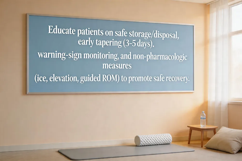 Patients should be instructed on safe opioid storage—keep pills in a locked cabinet—and disposal—use pharmacy take‑back programs or follow local guidelines. Before prescribing, consult the state Prescription Drug Monitoring Program to identify prior opioid use and avoid duplication. An early tapering protocol is advised: use the lowest effective dose for breakthrough pain and discontinue within 3‑5 days, tapering as comfort improves. Warning signs after hand surgery include increasing swelling, redness, warmth, throbbing pain, tight dressings, fever, chills, or loss of sensation; report these immediately. Cryotherapy (ice 15‑20 min every 2‑3 h), limb elevation above heart level, and early guided mobilization reduce edema and pain.
