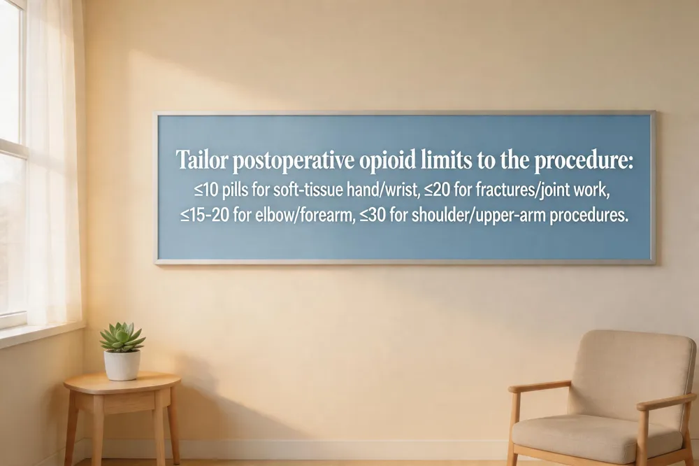 Hand and upper‑extremity surgeons prescribe roughly 7.7 % of U.S. opioid pills; yet most patients use far fewer tablets than given. Procedure‑specific data show that carpal‑tunnel release (CTR) patients consume about four pills, distal‑radius ORIF patients use 14‑16 pills, and shoulder or upper‑arm surgeries may require 22‑53 pills. Kim et al. therefore recommend postoperative limits of ≤10 pills for hand/wrist soft‑tissue surgery, ≤20 pills for hand/wrist fracture or joint work, ≤15‑20 pills for elbow/forearm surgery, and ≤30 pills for shoulder/upper‑arm procedures.