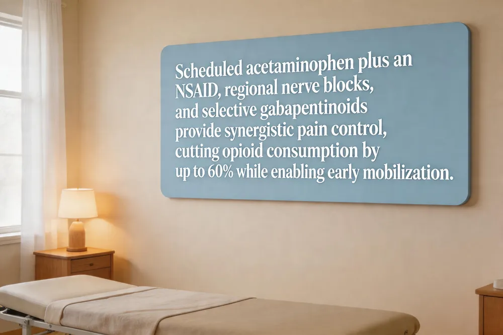 Multimodal pain management in orthopedic surgery blends several pharmacologic and regional strategies to control postoperative discomfort while limiting opioid exposure. A typical core regimen starts with scheduled acetaminophen (650 mg every 6 hours) and an NSAID such as ibuprofen 400‑600 mg every 8 hours or naproxen 250‑500 mg every 12 hours; celecoxib is an alternative for patients at gastrointestinal risk. These agents provide synergistic analgesia by acting on central and peripheral cyclo‑oxygenase pathways. When neuropathic pain is anticipated—e.g., after nerve decompression—gabapentinoids (gabapentin 300 mg or pregabalin 75 mg) are added pre‑emptively to blunt hyper‑excitability. Intra‑operatively, regional nerve blocks (brachial plexus, median, ulnar, or radial) or local infiltration of long‑acting bupivacaine (0.5 %) deliver targeted analgesia for the first 12–24 hours, reducing the need for systemic opioids.