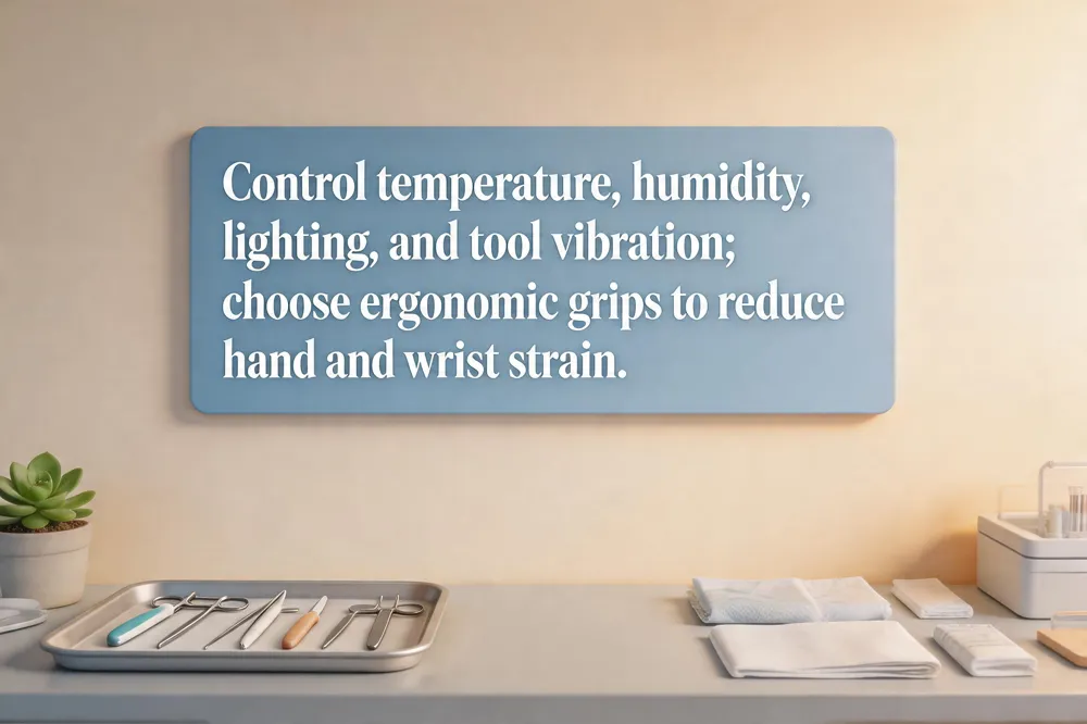 Lab temperature and humidity directly affect hand and wrist ergonomics. Cold environments reduce finger dexterity, causing workers to grip more forcefully and increase tendon stress, while excessive heat can cause sweating that leads to tighter grips and loss of fine motor control. Maintaining a stable, moderate temperature and using humidifiers or fans as needed keeps tissues supple and reduces unnecessary muscle tension.