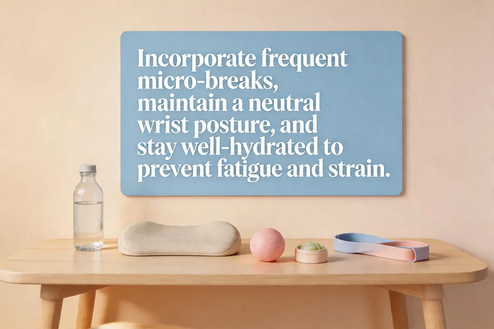 Keeping the wrists in a straight, neutral wrist position while typing or using a mouse, gripping tools loosely, and choosing ergonomic handles. Incorporate short, frequent micro‑breaks to let the forearm muscles relax, and adjust chair, desk, keyboard and mouse heights so elbows rest at about 90° and forearms are parallel to the floor. Stay well‑hydrated; adequate water intake maintains joint lubrication and reduces friction in wrist cartilage, helping to prevent strain.