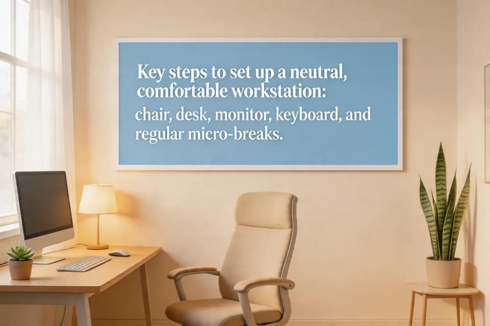 These steps create a neutral spine, reduce wrist/finger strain, and promote long‑term comfort for desk workers.