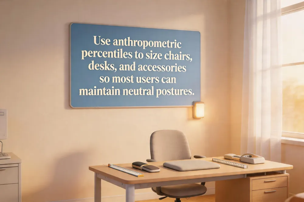 Anthropometry provides measurable data on human height, limb length, reach, and joint ranges, usually expressed in percentile values (e.g., 5th‑percentile female to 95th‑percentile male). Designers use these dimensions to size chairs, desks, keyboards, mice, and accessories so that most users can maintain neutral postures, reduce strain, and work comfortably.
