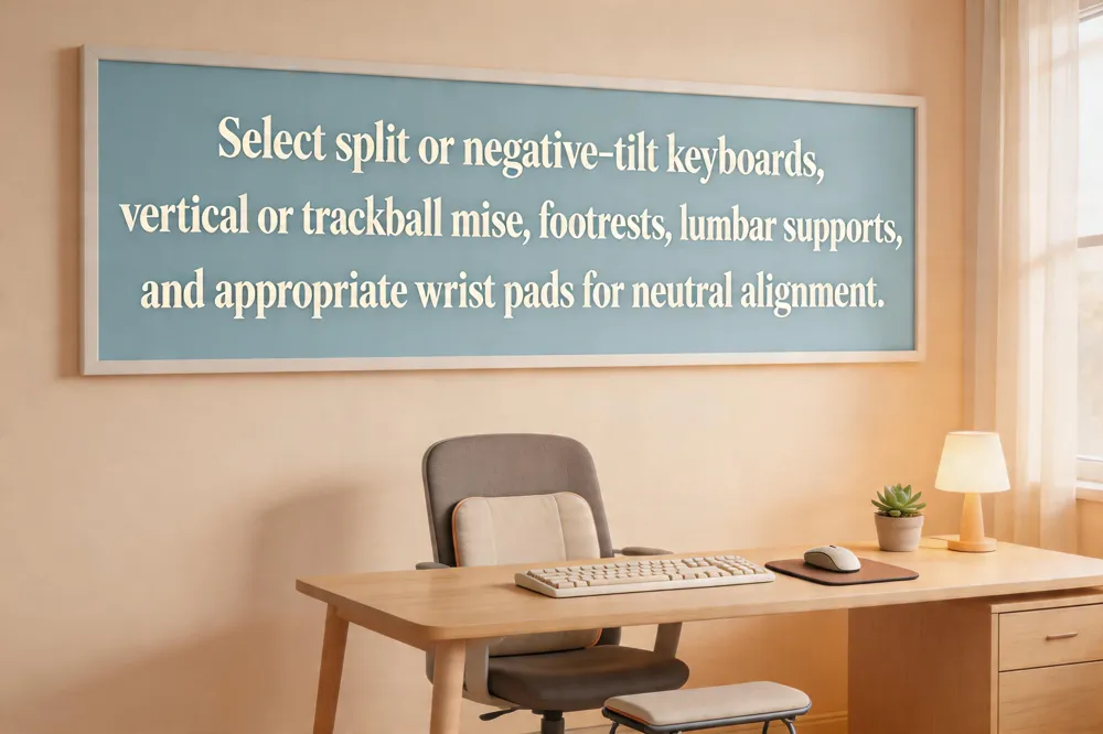 A well‑designed workstation starts with a split or negative‑tilt keyboard that keeps the forearms parallel to the floor and the wrists straight, lowering carpal‑tunnel pressure and ulnar deviation. Pair it with an ergonomic mouse that matches the hand’s natural "hand‑shake" posture; vertical or trackball models keep the wrist neutral, reduce pronation, and minimise repetitive twisting. Popular choices include the Logitech MX Master 4 and the Lekvey ProtoArc, both praised for low‑force, balanced movement.