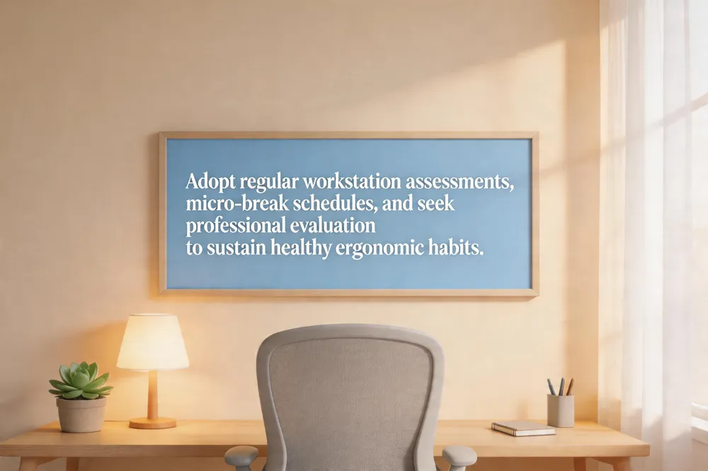 Schedule quarterly workstation reviews using a checklist (chair height, monitor level, keyboard/mouse placement, foot support). Adjust settings promptly to maintain neutral postures.