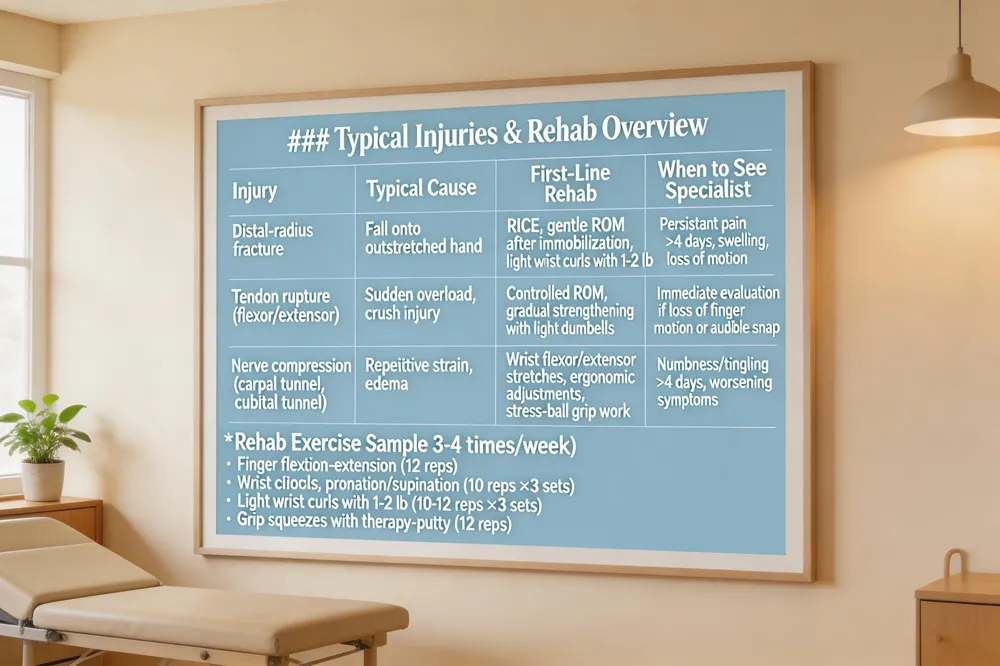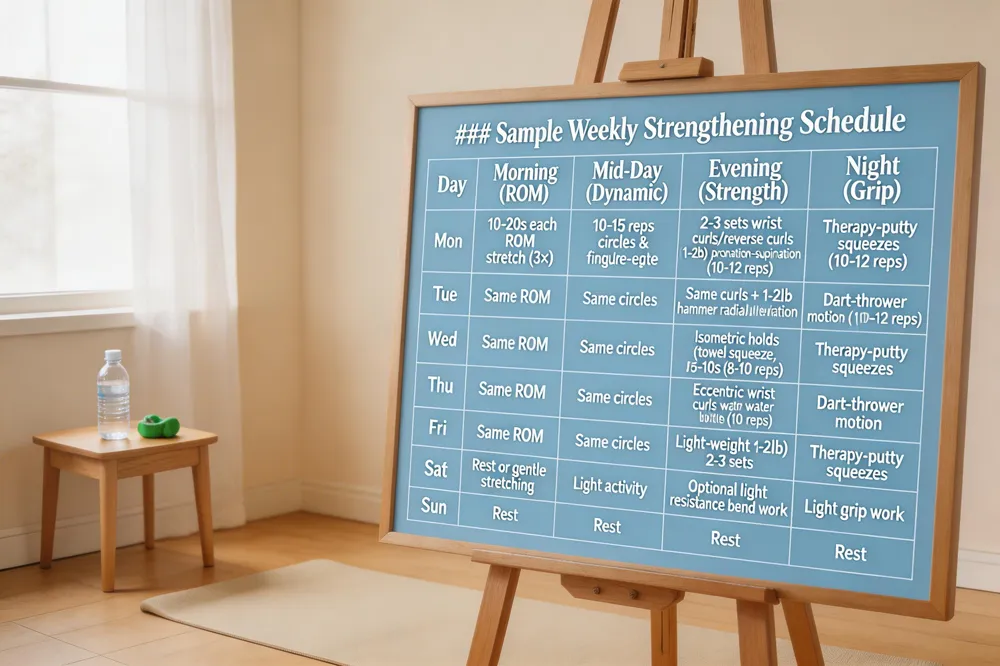 - Evening strengthening: 2‑3 sets of wrist curls/reverse curls (1‑2 lb) and pronation‑supination drills (10‑12 reps).