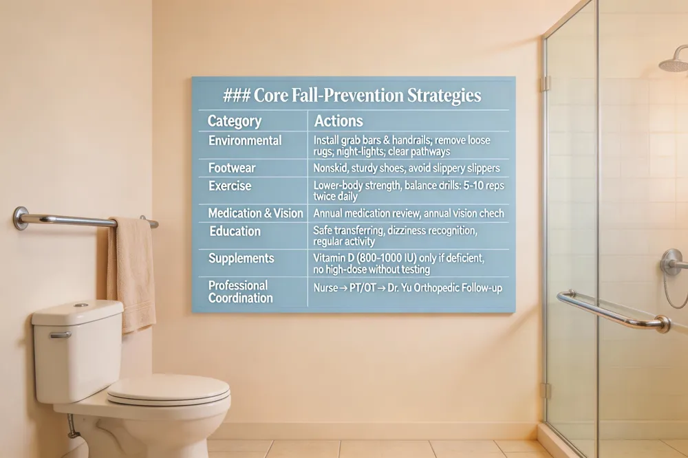 | Nurses should start with a comprehensive fall‑risk assessment that includes gait and balance testing, medication review, vision and hearing checks, and evaluation of chronic conditions such as diabetes or cognitive impairment. Identifying tripping hazards, securing loose rugs, installing grab bars and night‑lights, and ensuring sturdy, nonskid footwear are essential environmental modifications. Education is key: nurses teach patients and caregivers safe transferring techniques, the importance of regular physical activity, and how to recognize dizziness or weakness. Coordinating with physical therapists to implement individualized strength‑training and balance exercises (e.g., tai chi, resistance bands) further reduces risk. Finally, nurses document and communicate any status changes to the orthopedic team so that Dr. Yu can integrate surgical precautions into a holistic fall‑prevention plan. |