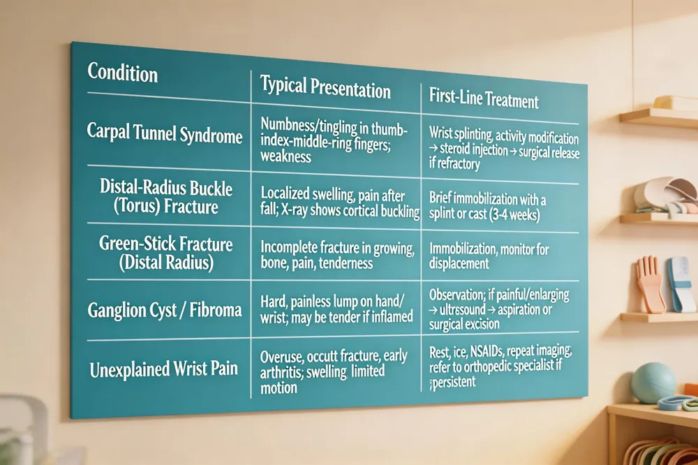 Unexplained wrist pain in a child may stem from overuse, an occult fracture, or early inflammatory arthritis. A thorough history, repeat imaging and conservative care (rest, ice, NSAIDs) are initial steps; persistent pain requires prompt orthopedic evaluation to prevent long‑term dysfunction.