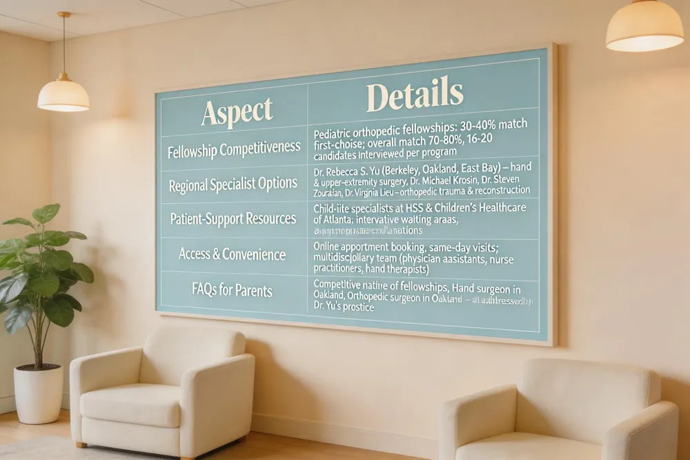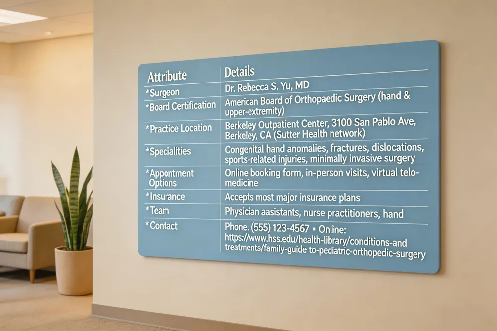 Regional specialist options: Dr. Rebecca S. Yu, MD, a board‑certified orthopedic surgeon specializing in hand and upper‑extremity surgery, serves children and adults from Berkeley, Oakland, and the wider East Bay. Her practice offers minimally invasive, microsurgical techniques for congenital hand differences, fractures, tendon injuries, and growth‑plate disorders. Online appointment booking and same‑day visits make access easy for families across the region.