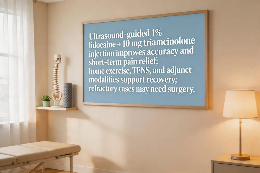 De Quervain's tenosynovitis typically presents with radial‑wrist pain, a positive Finkelstein test and ultrasound evidence of swollen APL and EPB tendons with peritendinous fluid, as seen in a 56‑year‑old printing‑press worker. The first‑line injection technique uses a 24‑gauge needle to deliver 1 mL of 1 % lidocaine mixed with 10 mg triamcinolone into the inflamed tendon sheath, avoiding the radial artery and tendons. Ultrasound‑guided injections allow real‑time visualization of the APL/EPB tendons, fluid, and needle trajectory, leading to higher accuracy and slightly better short‑term pain reduction than blind injections; both methods, however, achieve cure rates >80 % when performed early (≤6 months). Complications are rare but can include infection but can include skin atrophy, subcutaneous fat loss, tendon rupture, or infection if the steroid is injected intra‑tendinously or sterility is compromised. For patients who respond, a structured home‑exercise program—downloadable PDFs from Emergent Orthopaedics and OAHCT, or the Physiopedia regimen of eccentric wrist strengthening, radial deviation with light weight, and resisted thumb motions—can be started 2–3 times daily for 4–6 weeks. TENS may adjunctively be placed with one electrode over the first dorsal compartment and the other on the opposite ulnar side, 30–40 minutes per session. Most individuals achieve pain‑free function within 4–6 weeks; refractory cases may require minimally invasive surgical release, which yields durable relief in >90 % of patients.