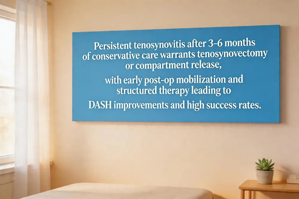 Chronic tenosynovitis that persists despite 3–6 months of activity modification, splinting, NSAIDs, and corticosteroid injections is an indication for tenosynovectomy or compartment release. Open microsurgical release provides direct visualization of the inflamed sheath, while minimally invasive endoscopic or percutaneous techniques—favored by board‑certified hand surgeons such as Dr. Rebecca S. Yu in Berkeley, CA—reduce tissue disruption and enable faster recovery. Post‑operative rehabilitation begins within 24‑48 hours with gentle passive range‑of‑motion, progresses to active thumb and wrist stretches (thumb‑MP joint, Finkelstein, radial deviation) by week 2, and incorporates resisted strengthening (elastic band, putty ball) and functional tasks by weeks 4‑6. Patient‑reported outcomes consistently improve, with DASH scores dropping 40‑50 points and most patients achieving pain‑free daily activities within 6‑12 weeks. Complications are rare (<5 %); they include infection, scar tissue, temporary weakness, or superficial radial nerve irritation, and are mitigated by meticulous surgical technique and adherence to structured hand‑therapy protocols.