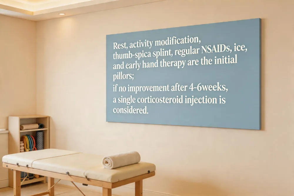 Rest and activity modification are the cornerstones of early care; patients should avoid repetitive thumb‑wrist motions, take frequent micro‑breaks, and limit gripping tasks for 4–6 weeks. A thumb‑spica splint or custom brace immobilizes the first dorsal compartment, reducing tendon glide and allowing the inflamed sheath to settle. NSAIDs such as ibuprofen or naproxen are taken on a regular schedule to control pain and swelling, while ice packs (20 minutes, 2–3 times daily) are preferred in the acute phase; heat may be added later to relax the sheath. Hand/occupational therapy begins once pain eases, focusing on gentle range‑of‑motion drills, edema control, ergonomic education, and progressive strengthening with putty or elastic bands.