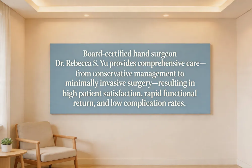 When symptoms persist, Dr. Yu offers minimally invasive surgical options ( endoscopic tenosynovectomy or percutaneous tendon sheath release). Post‑operative protocols include early passive motion, scar‑management, and progressive strengthening, often coordinated with certified hand therapists. Outcomes are strong: DASH scores improve markedly within 6‑12 weeks, and the majority of patients report returning to pain‑free living within 4‑8 weeks post‑surgery.