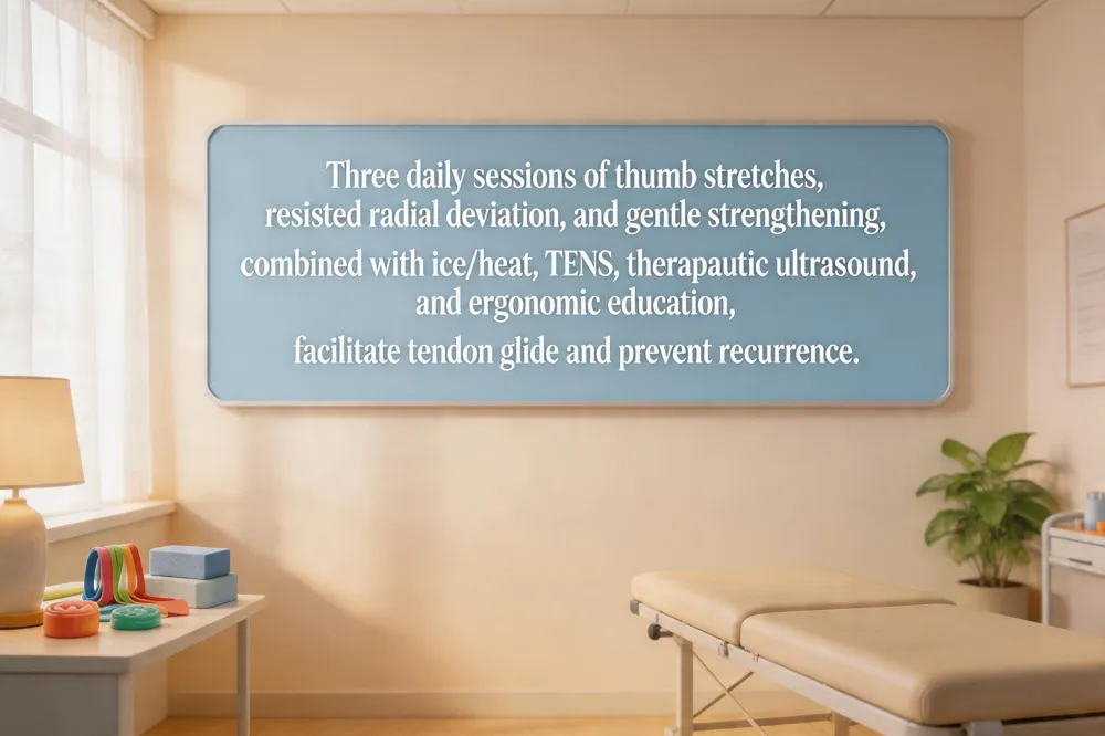 A structured stretching and strengthening program is central to De Quervain’s tenosynovitis recovery. Patients perform three daily sessions of thumb MP‑joint stretch, Finkelstein stretch, thumb flexion‑extension, adduction‑abduction, and resisted radial deviation with a light elastic band (8‑12 reps, 2‑4 times per day). Gentle strengthening with a putty ball or rubber band promotes tendon glide while avoiding aggressive gripping, wrist‑twisting, or repetitive thumb‑up‑and‑down motions that can aggravate the sheath.