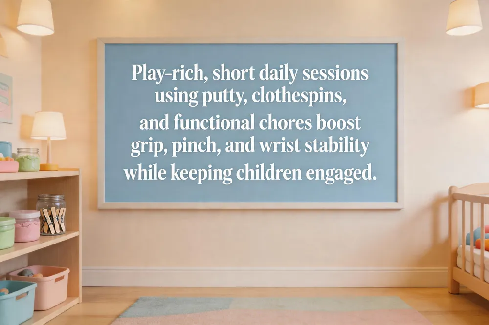 Integration into daily routines is essential. Parents can embed short 5‑10‑minute sessions 2‑3 times per day during snack prep, bath time, or bedtime story. A “hand‑strength red‑flag” checklist helps families spot fatigue or difficulty gripping, prompting early therapist contact. Consistent, play‑rich practice builds endurance, supports school‑related fine‑motor skills, and keeps children motivated while their hands grow stronger.