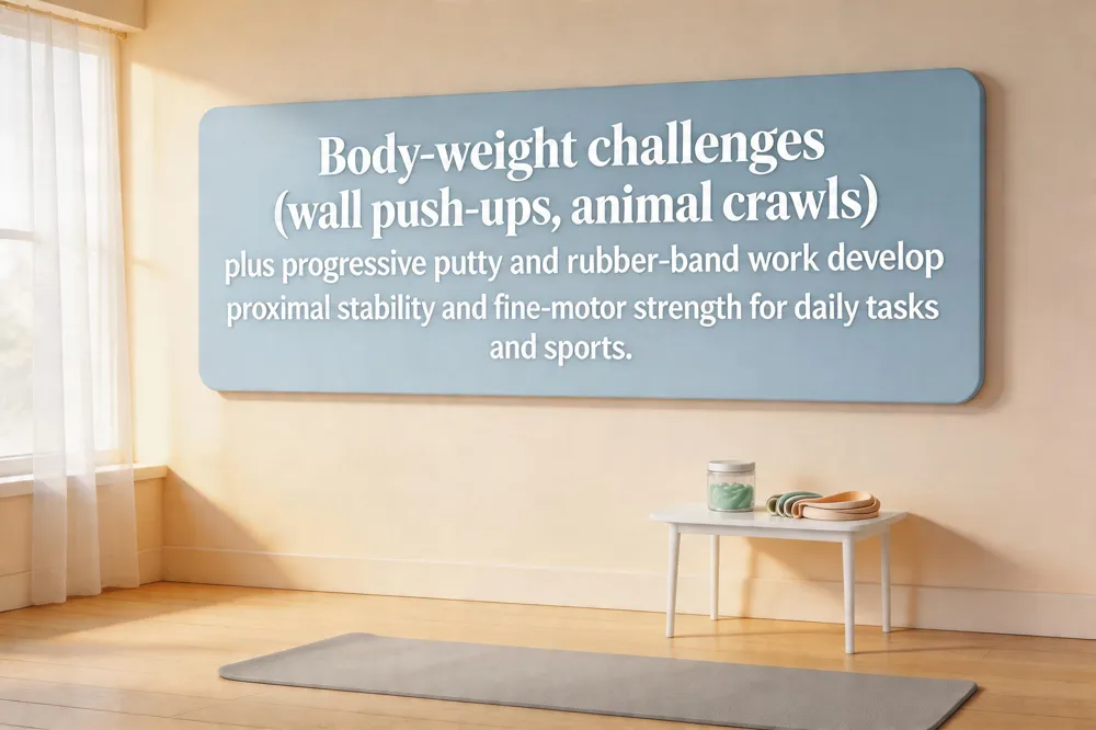 Body‑weight exercises are the foundation for a 7‑year‑old’s arm development. Activities such as wall push‑ups, crab walks, wheel‑barrow walks, and animal crawls engage the shoulder girdle, chest, and grip without heavy loads. Playground staples—monkey bars, tug‑of‑war, and pulling a stroller or shopping cart—add pulling and pushing challenges while keeping the child motivated. Short forearm‑supported planks, vertical drawing on easels, or climbing over cushions provide varied positions that reinforce proximal stability and wrist alignment. Aim for 2‑3 sessions per week, starting with a few repetitions and increasing as form stays good.