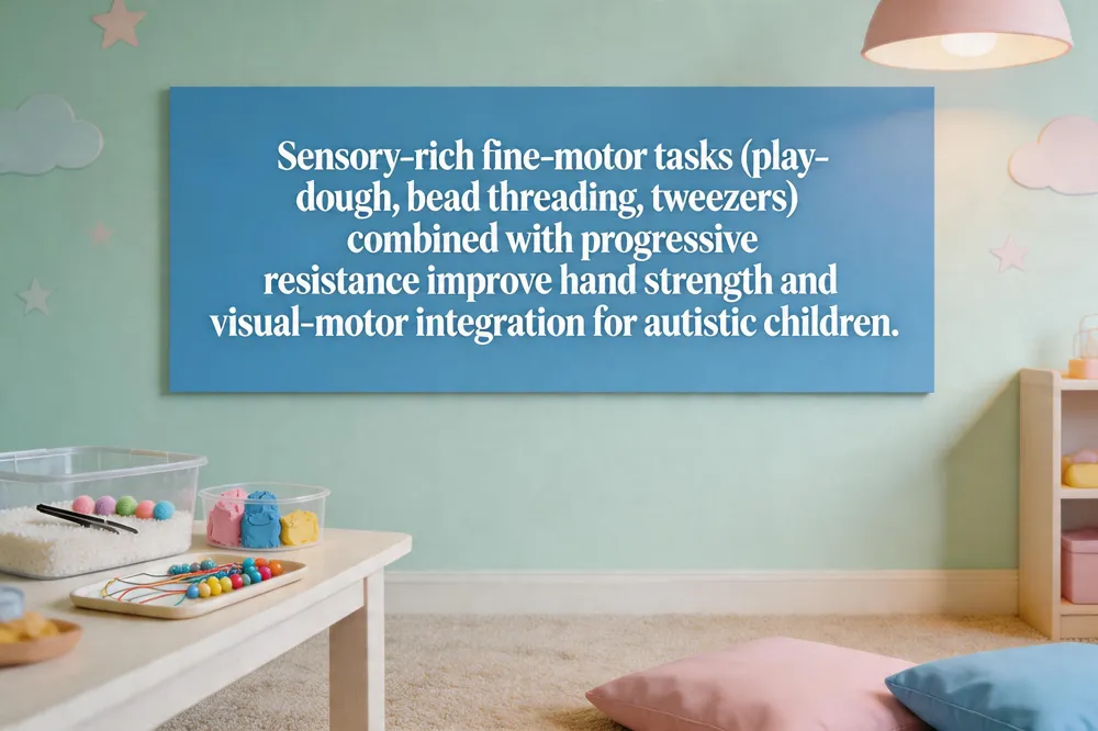 For children on the autism spectrum, hand‑strengthening activities should blend sensory input with purposeful fine‑motor practice. Sensory‑rich fine‑motor tasks such as kneading, rolling, and squeezing play‑dough or modeling clay give tactile feedback while engaging finger flexors and extensors. Sorting games—threading beads, moving paper clips, or assembling LEGO bricks—develop pincer grasp, coordination, and hand‑eye integration. Using tweezers, tongs, or clothespins to pick up small objects builds pinch strength and thumb‑index opposition. Hand‑eye coordination games like tapping a drum, pressing piano keys, or affixing cloth‑peg “hair” to a cardboard head require precise timing and visual‑motor integration.