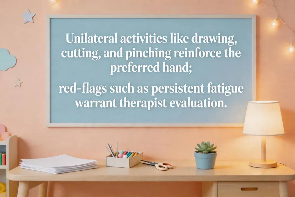 When to be concerned: Red flags include persistent difficulty gripping writing utensils, early fatigue during weight‑bearing activities, trouble buttoning or zipping, and the need for help opening containers. These signs suggest limited hand strength or delayed dominance and warrant evaluation by an occupational therapist or pediatric hand specialist.