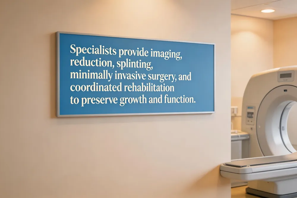 Pediatric orthopedic hand surgeons evaluate and treat traumatic hand injuries, growth‑plate fractures, and chronic hand conditions in children. They use child‑friendly imaging, closed reduction, splinting or cast immobilization, and when needed minimally invasive surgery that preserves growth plates. For growth‑plate fractures, surgeons ensure proper alignment, monitor for redisplacement, and schedule follow‑up X‑rays to prevent growth arrest. Rehabilitation is coordinated with hand therapists; after immobilization, children begin range‑of‑motion and grip‑strength exercises, followed by a graduated return‑to‑play plan that typically spans 2‑8 weeks depending on injury type.