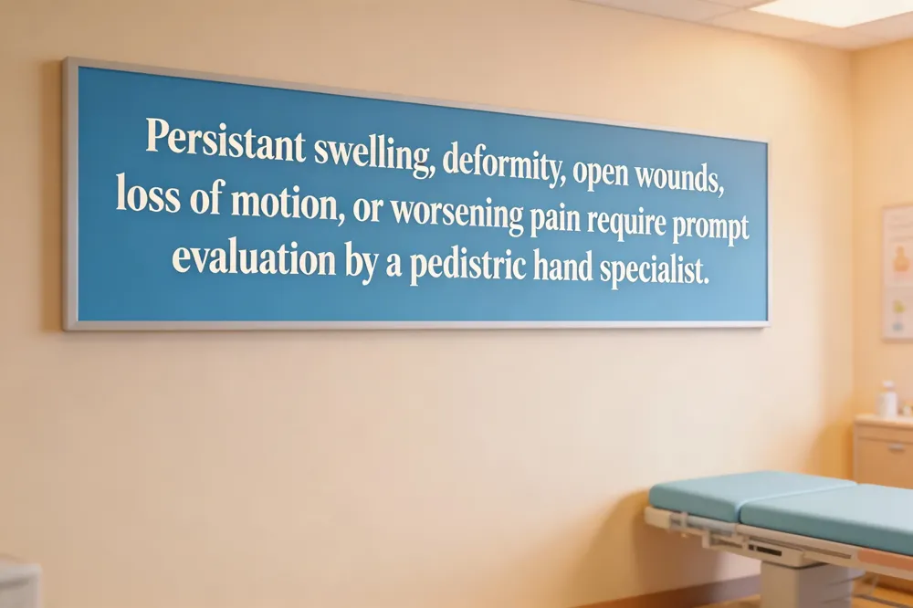 Deformity, loss of motion, numbness, or tingling are warning signals for fractures, dislocations, growth‑plate injuries, or tendon damage. If a child cannot fully bend or straighten the wrist, has a noticeable bump or bruising, or experiences weakness or loss of grip strength, a pediatric hand surgeon should be consulted promptly. Persistent swelling beyond one to two days, worsening pain with movement, or any neurological changes (numbness/tingling) are indications that imaging and specialist care are needed to prevent long‑term functional problems.