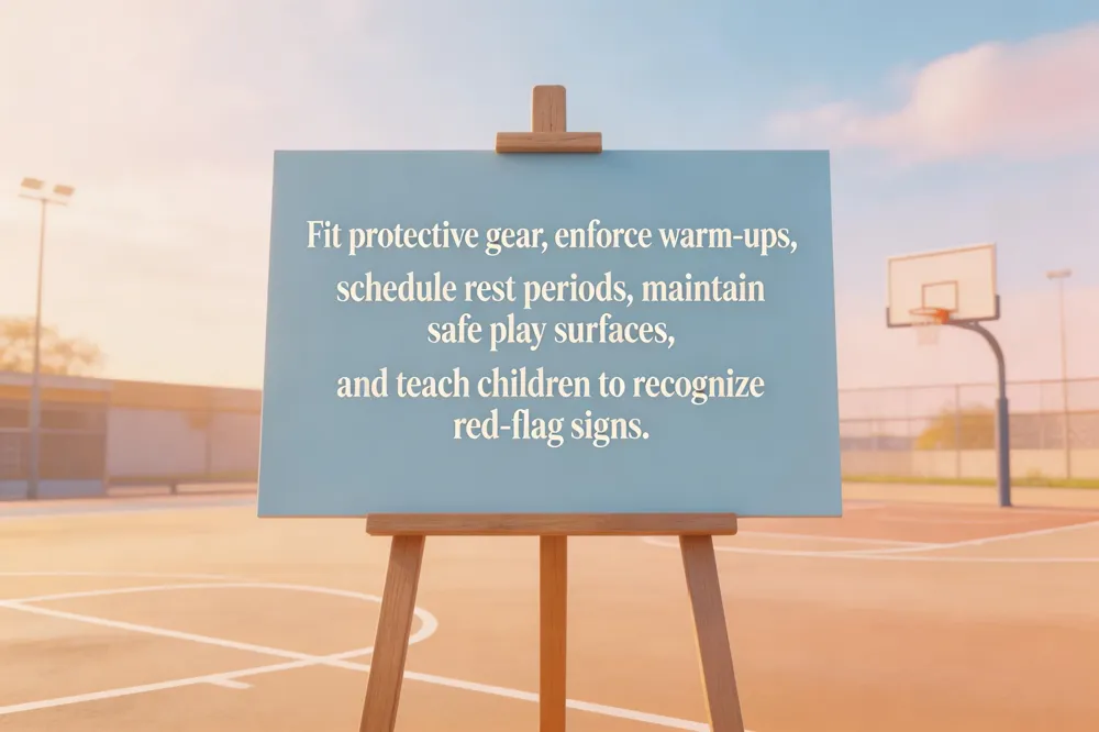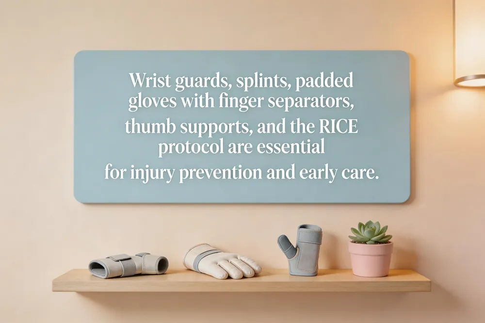 Sports‑related injury prevention: Ensure a thorough warm‑up with dynamic finger, wrist, and forearm stretches, fit sport‑specific protective gear (gloves, wrist guards) correctly, and schedule regular rest days and off‑season breaks. Encourage balanced nutrition, hydration, and cross‑training to reduce overuse. Parents should watch for swelling, pain, deformity, or inability to move and obtain immediate evaluation from a pediatric hand specialist.