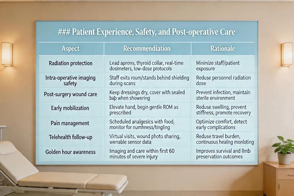 Radiology assistance tools and AI – Real‑time dosimeters, protective shielding and lead aprons safeguard staff during intra‑operative cone‑beam CT or fluoroscopy. AI algorithms now detect distal radius fractures on radiographs with ~93 % accuracy and can auto‑measure hand‑bone alignment, shortening diagnosis and guiding surgical planning.