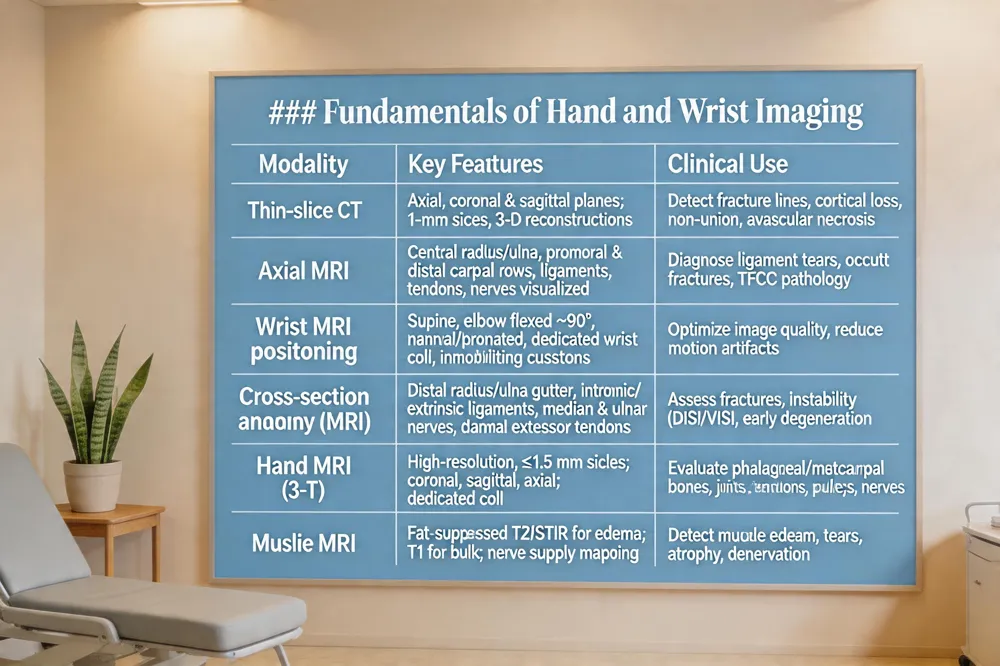 | MRI (3‑T, dedicated coil) | Soft‑tissue, ligament, nerve pathology; cartilage assessment | Ligament tears, TFCC injury, tendon pathology, bone‑marrow edema |