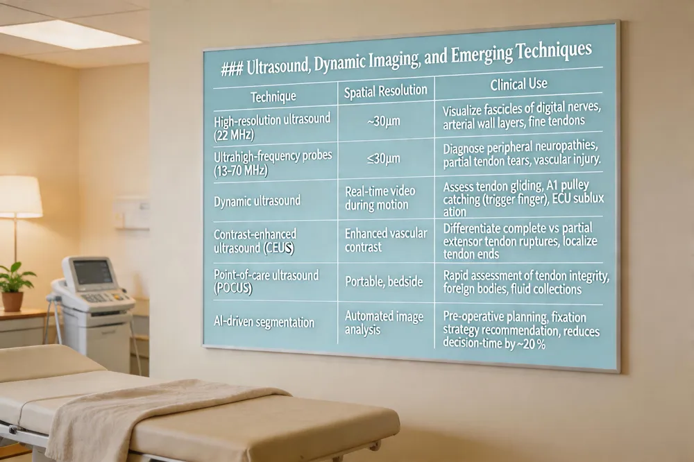 | Ultrasound (high‑frequency) | Dynamic tendon evaluation, nerve entrapment, superficial fluid collections | Real‑time tendon gliding, A1 pulley catching, nerve morphology |