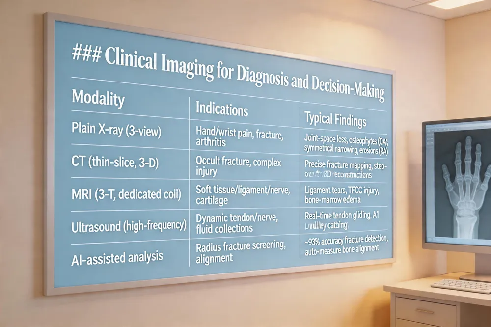 | Plain X‑ray (3‑view) | Initial assessment of hand/wrist pain, suspected fracture, arthritis | Joint‑space loss, sub‑chondral sclerosis, osteophytes (OA); symmetrical narrowing, marginal erosions (RA) |