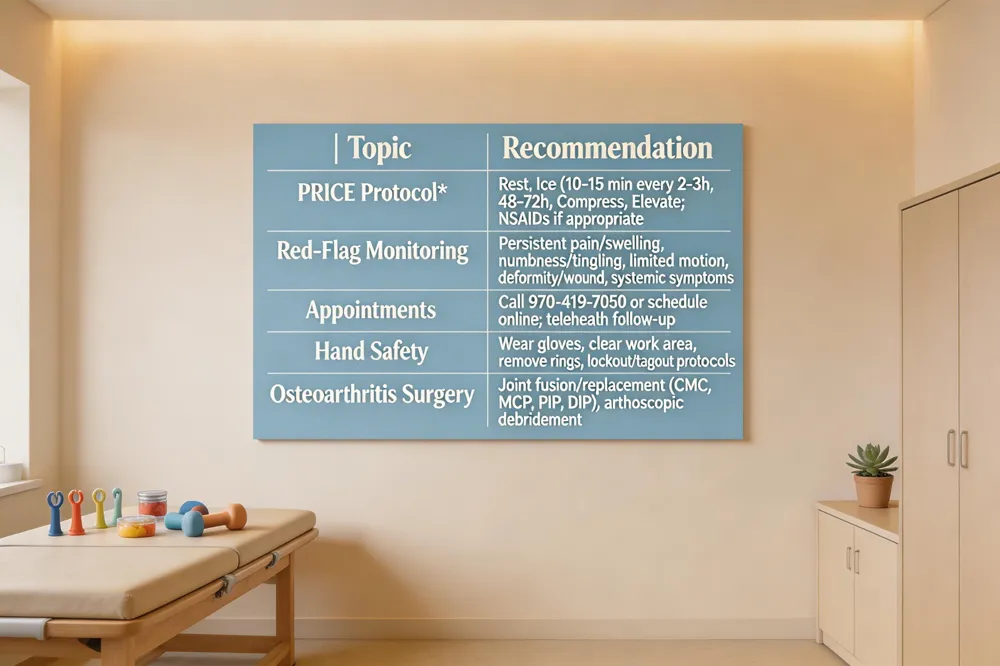 Appointment scheduling and telehealth – For mild symptoms, call an online appointment: appointment 970‑419‑7050 or use the Orthopaedic & Spine Center of the Rockies website. Telehealth visits are appropriate for follow‑up of non‑operative injuries, medication adjustments, and splint education.