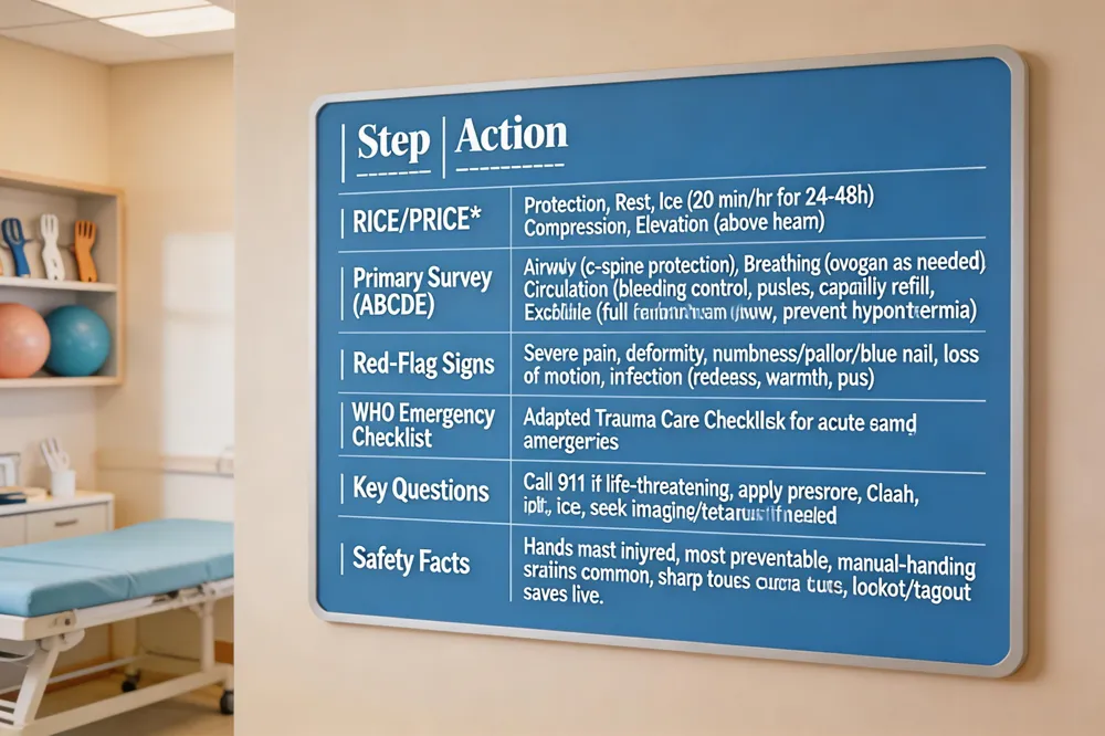 Red‑flag monitoring after injury – Watch for any of these five warning signs: (1) persistent pain or swelling that does not improve, (2) numbness, tingling, or loss of sensation, (3) limited motion or inability to move the joint without severe pain, (4) visible deformity, deep bruising, or an open wound suggesting fracture, (5) systemic symptoms such as headache, dizziness, or worsening pain hours later. Promptly contact your doctor if any occur.