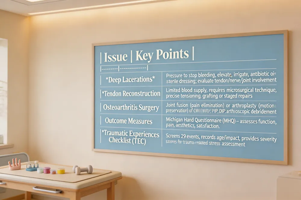 Types of hand injury – Injuries involve bones (phalanges, metacarpals, carpal bones), joints (dislocations, sprains), tendons (flexor/extensor tears, mallet finger), nerves, ligaments (Skier’s thumb), skin lacerations, and crush/compartment injuries. Each category follows specific treatment pathways.