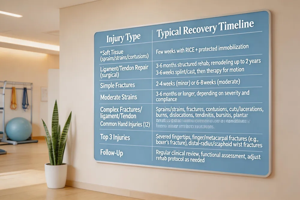 Hand injury recovery time – Simple fractures need 3–6 weeks of splinting/casting, then therapy to regain motion. Minor strains heal in 2–4 weeks; moderate strains 6–8 weeks. Complex fractures, ligament tears, or tendon repairs can extend rehab to 3–6 months or longer, depending on age, health, and adherence.